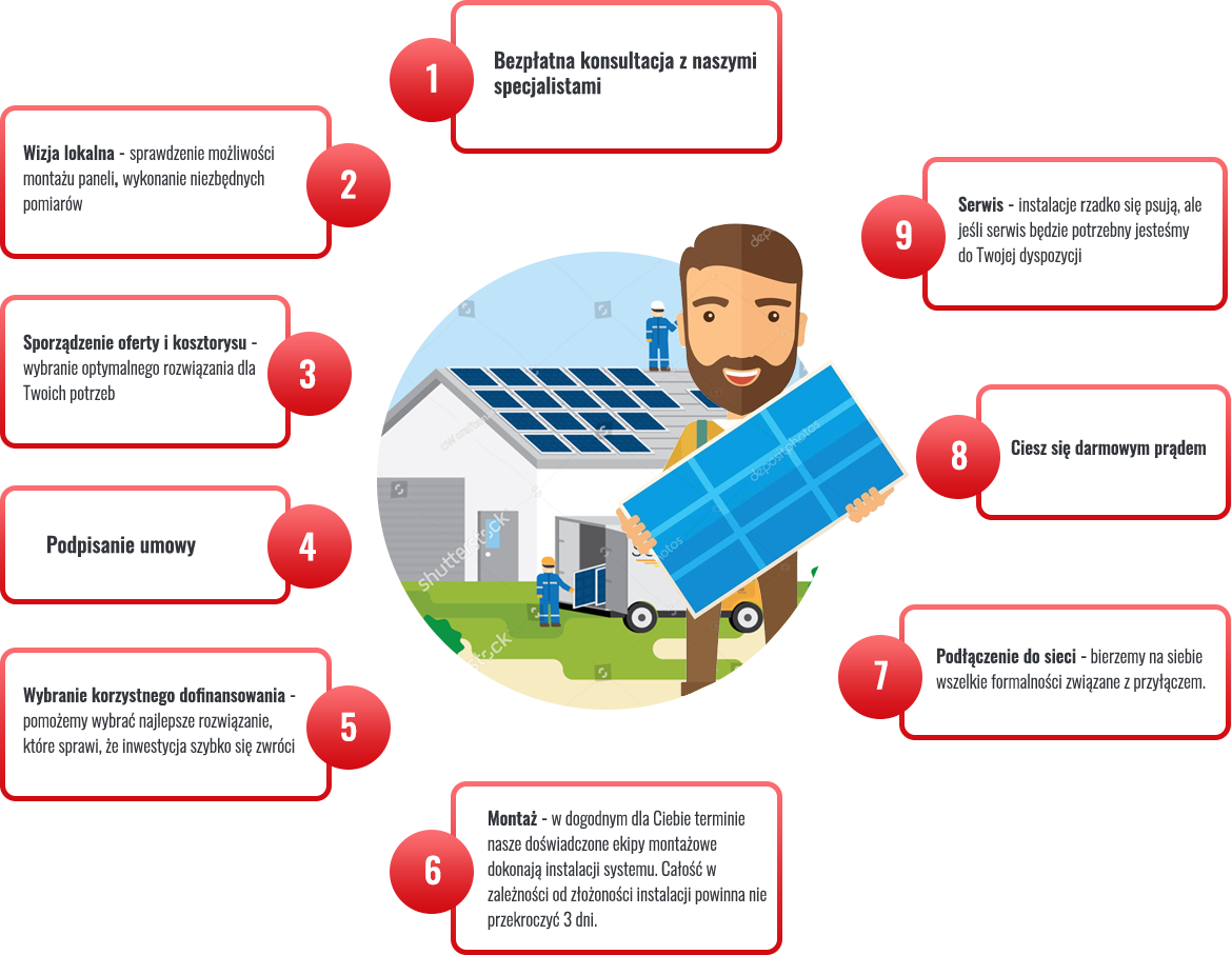 Darmowa energia ze słońca to coś co się opłaca. By się o tym przekonać zapraszamy na bezpłatne konsultacje. Wyjaśnimy na czym polega produkcja energii, jak i skąd pozyskać fundusze na instalacje. Odpowiemy na wszystkie nurtujące Cię pytania. Koniecznie zabierz ze sobą ostatnie rachunki za prąd. Powiemy ile możesz zaoszczędzić.